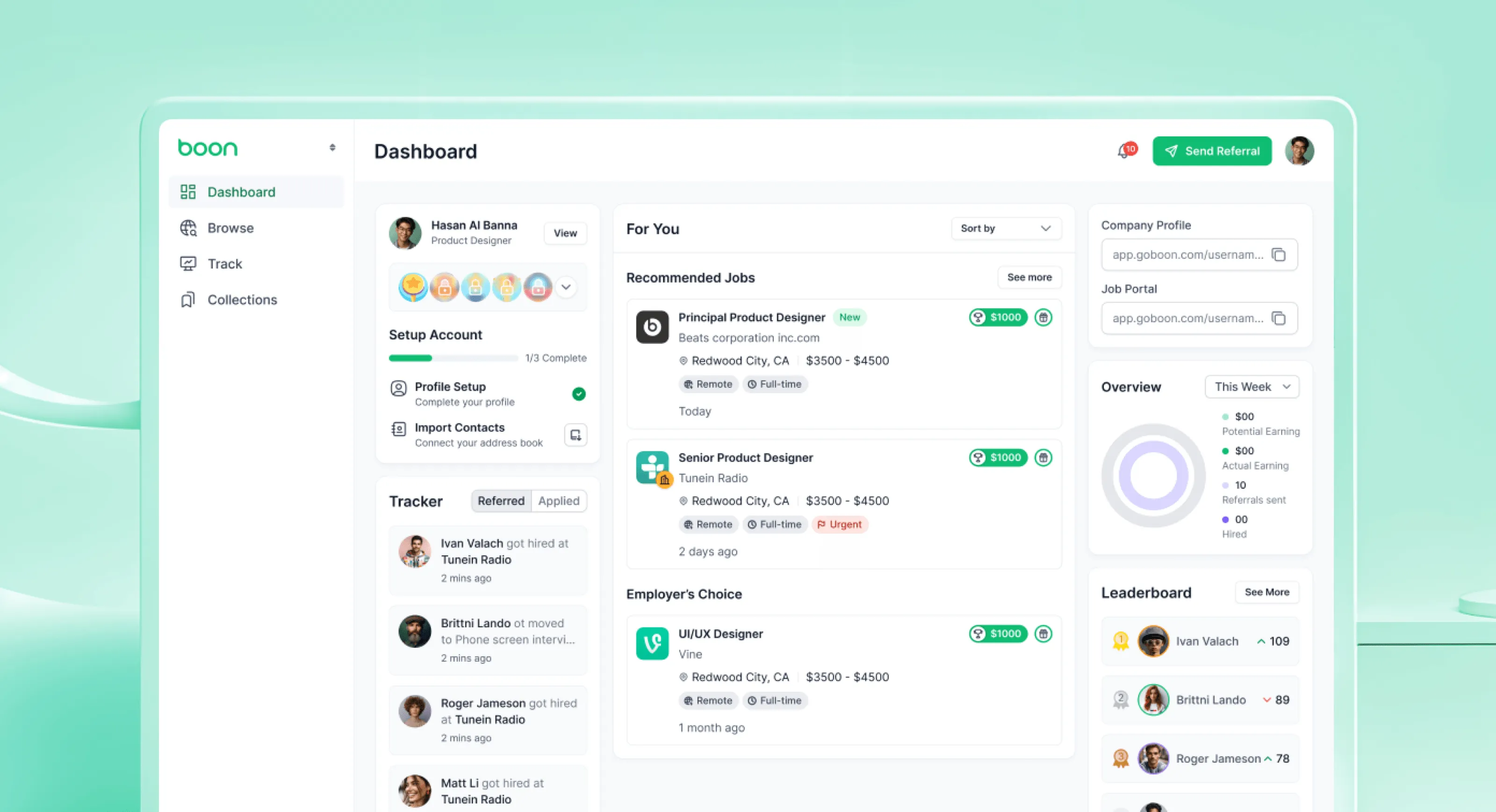 Modern and minimal design solutions for job referrals and application tracking.