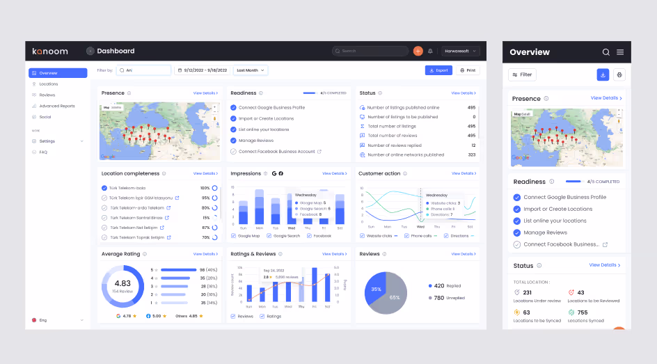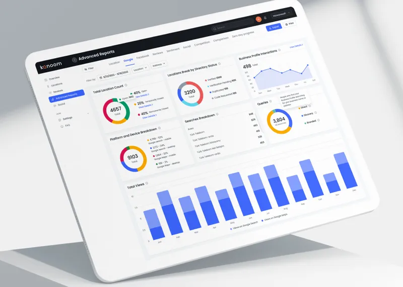 Konoom's dashboard review emphasizes clarity and efficiency, presenting crucial data in a visually accessible manner for multi-location brands to enhance their online reputation effortlessly.