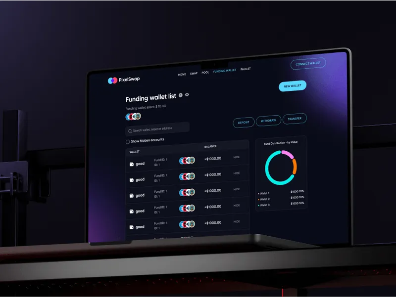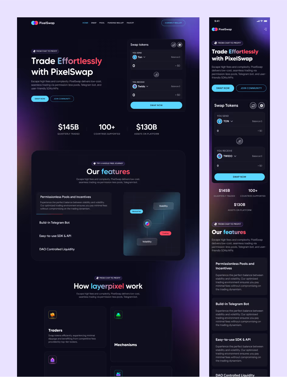 For the PixelSwap landing page, we designed a clean, engaging layout that catered to both novice and expert users, highlighting key features and benefits for quick understanding and appreciation of the decentralized exchange.
