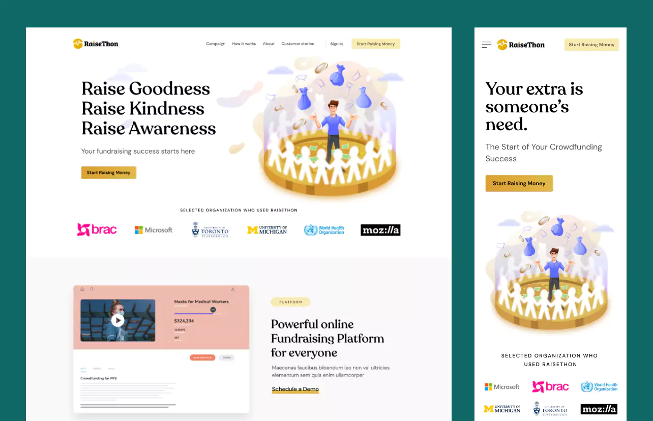 In the Raisethon project, we undertook the redesign of a fundraising platform. This platform helps NGOs and fundraisers connect to their potential donor.