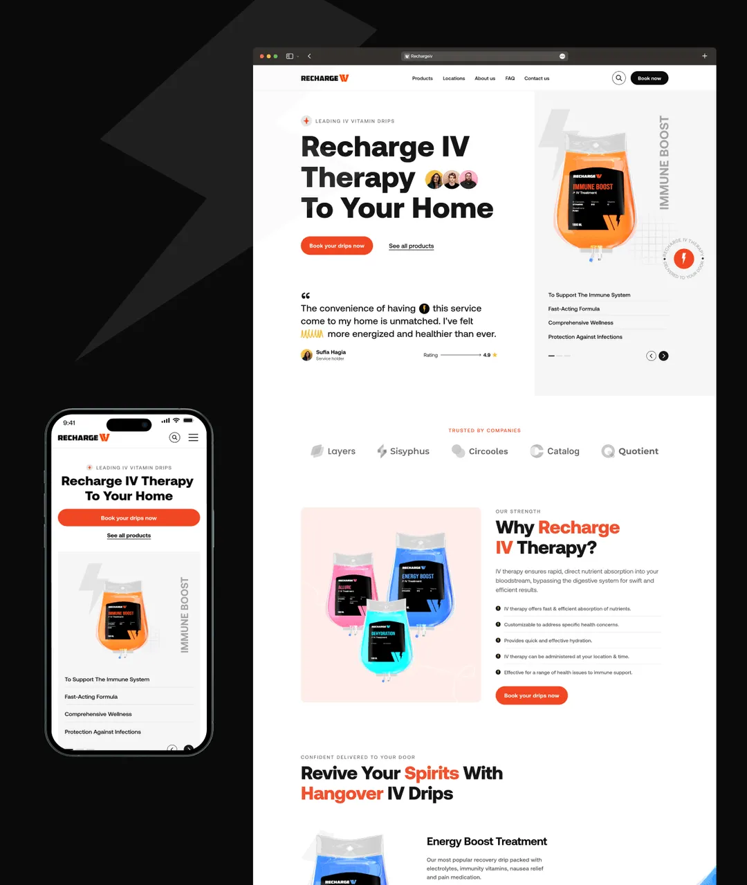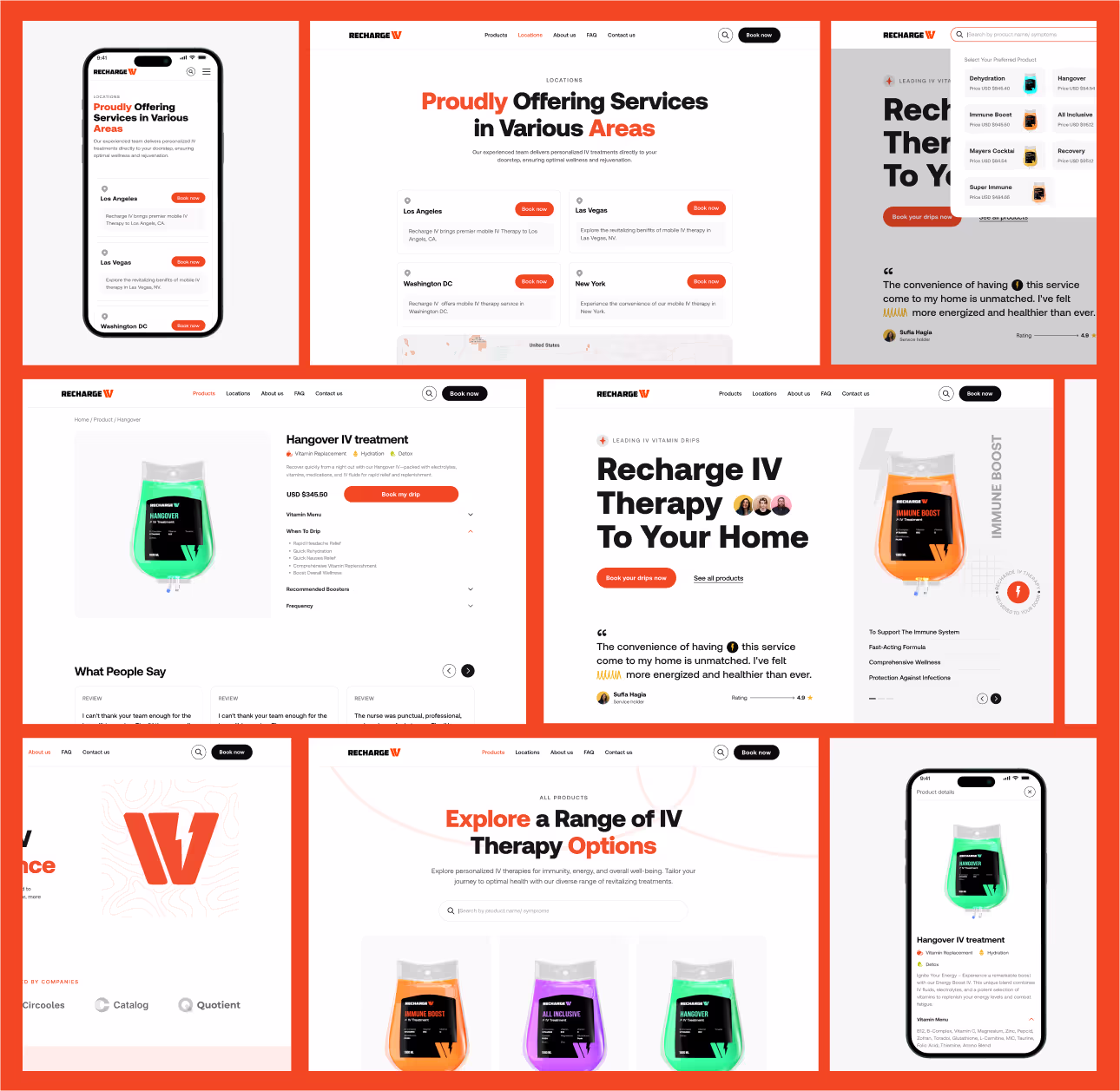 The client wanted a website for Recharge IV that makes booking door-to-door drip therapies effortless. They emphasized the importance of keeping the design consistent even when adding new drip and wellness products.
